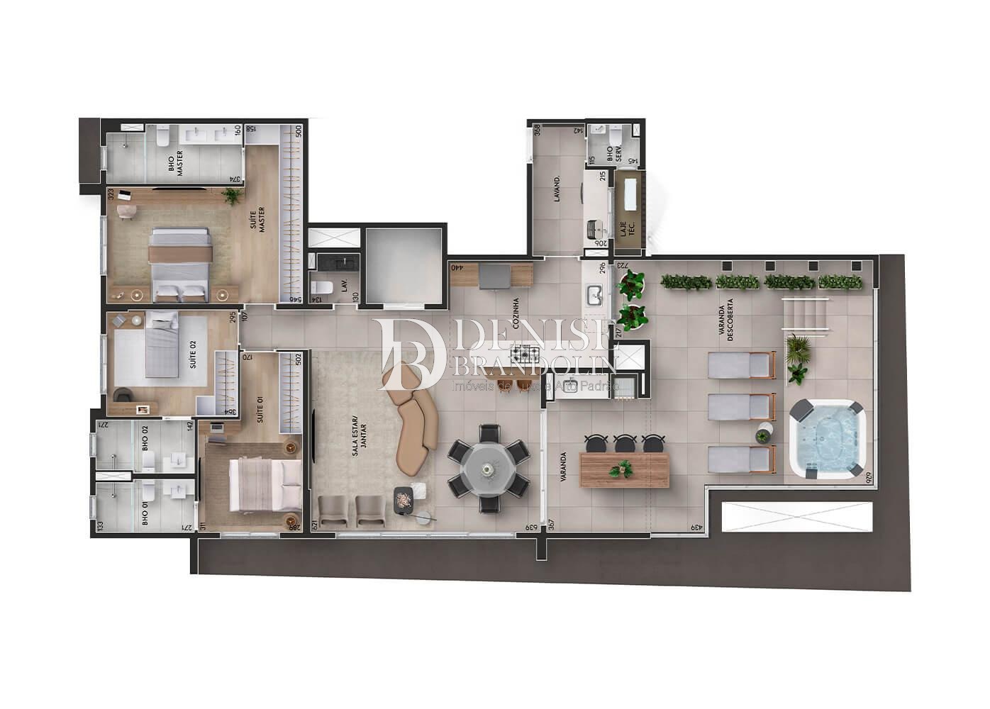 Planta Garden com 3 suítes, sala de estar, sala de jantar, lavado, cozinha aberta, varanda gourmet, lavanderia, dormitório e banheiro serviço.