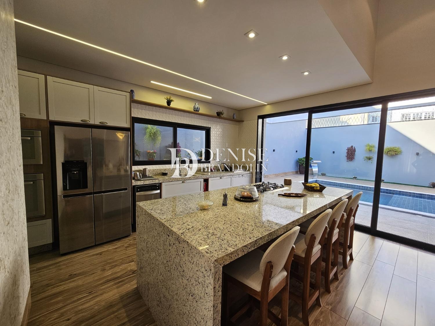 Espaço gourmet com churrasqueira, piscina aquecida, iluminação em led e cascata,