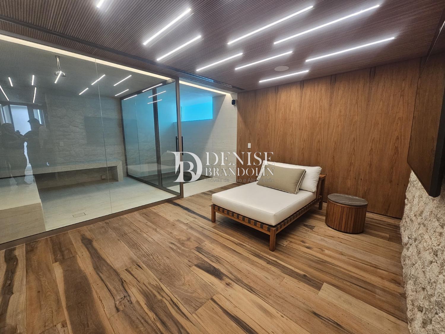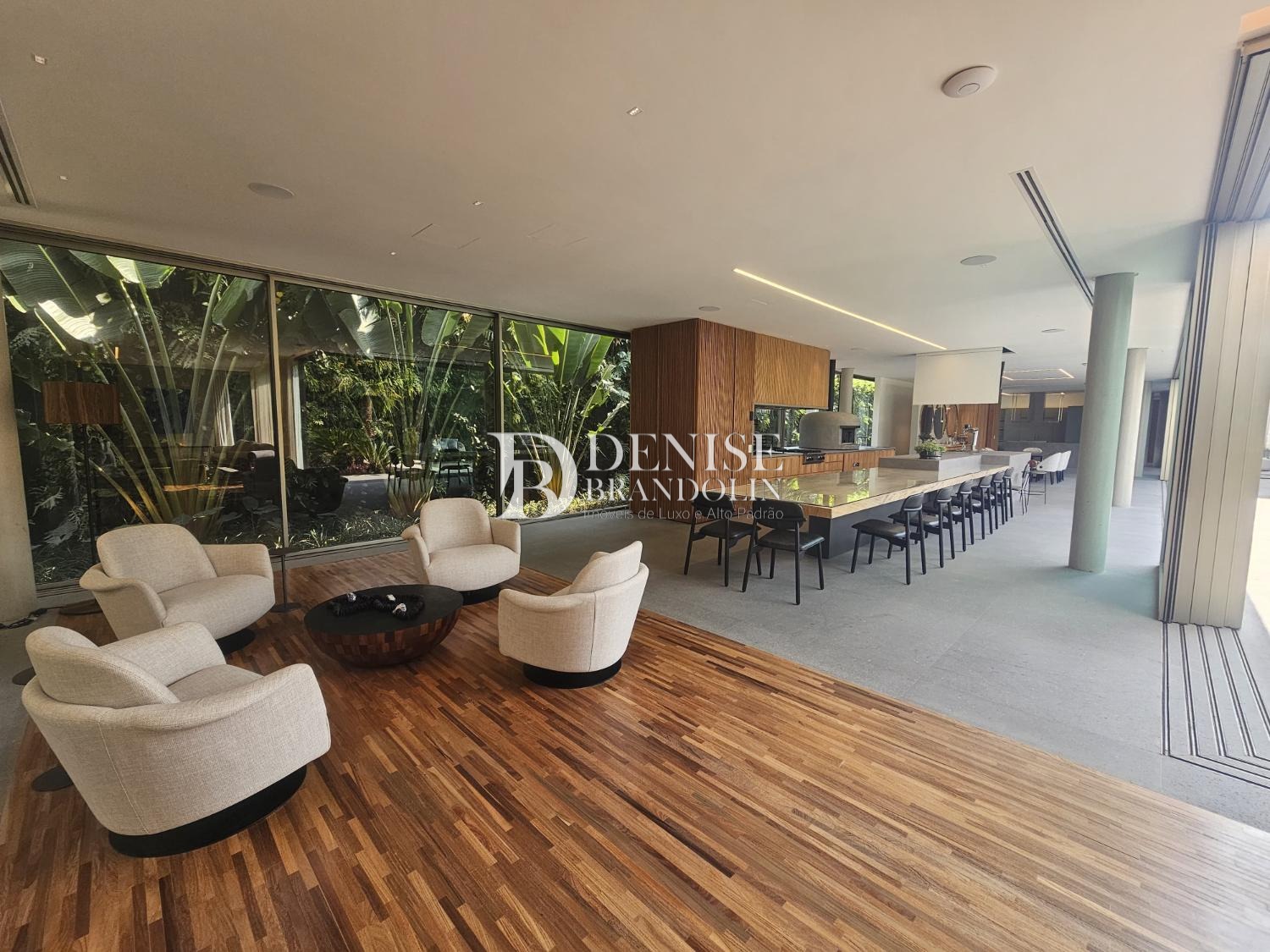 Charmoso living com pé direito altíssimo para vários ambientes, elevador todo revestido em madeira e um lindo gourmet todo integrado, muito aconchegante e agradável.