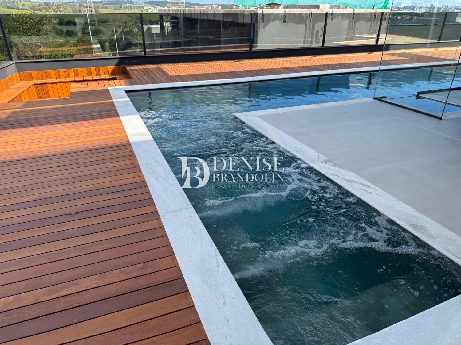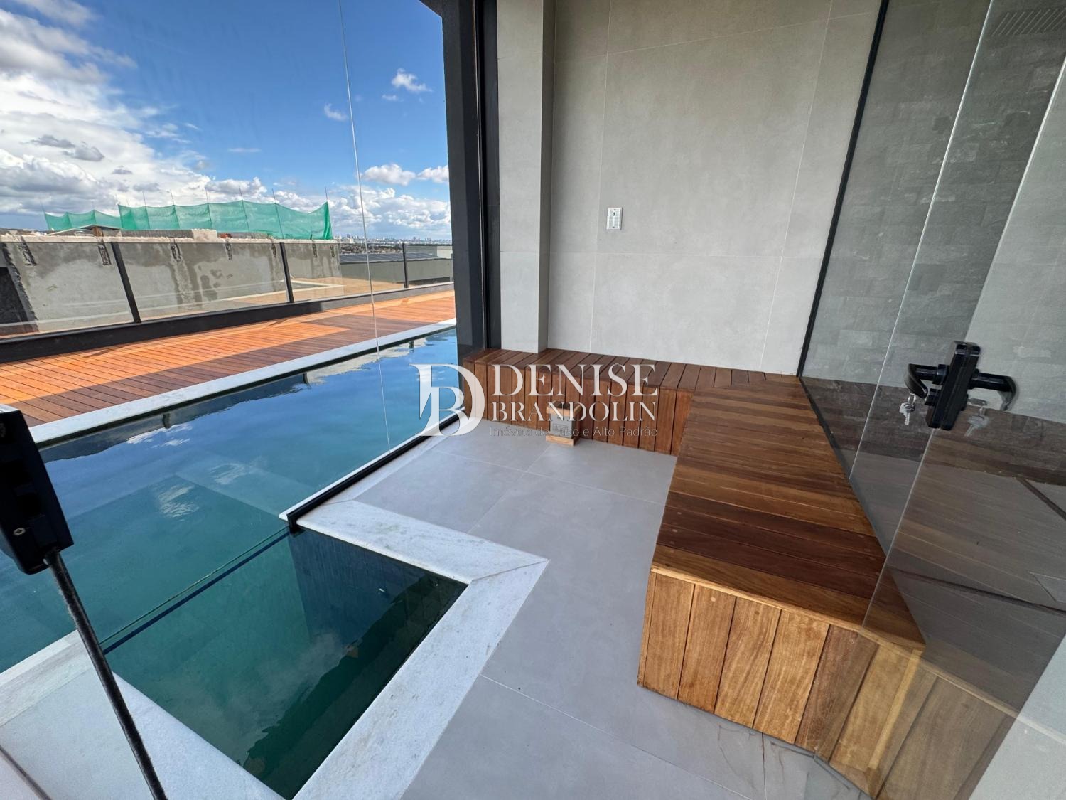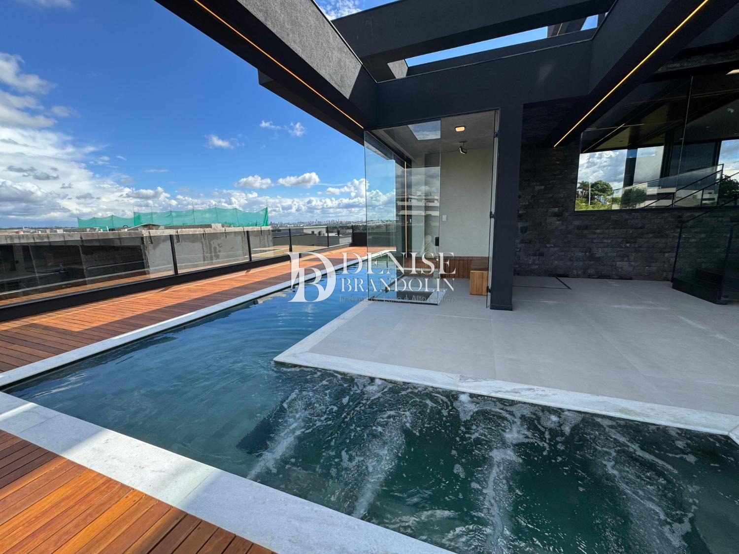 Piscina aquecida revestida de pedra Hijau, com prainha, jacuzzi e cascata, está integrada com uma sauna úmida de vidro. Espaçosa área de lazer, e grande deck de madeira cumaru, com fire place