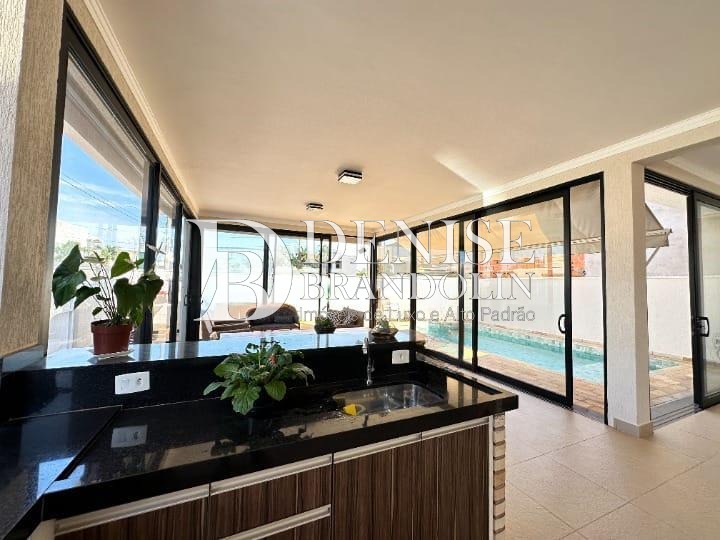 Espaço gourmet com churrasqueira, piscina e quintal.
