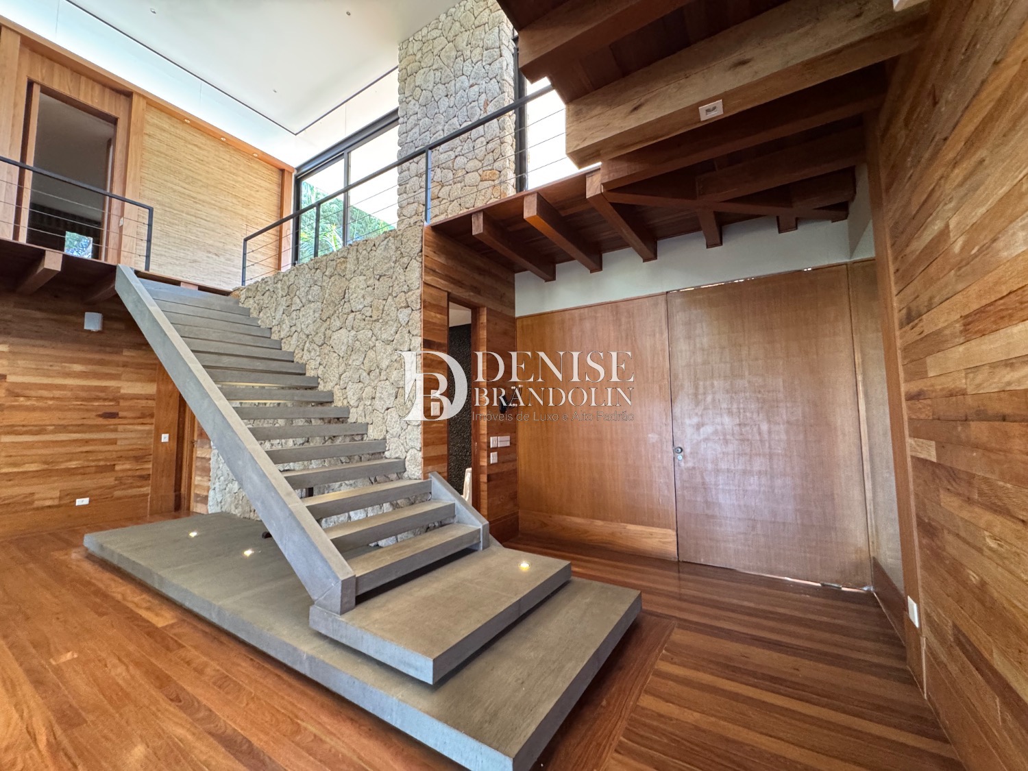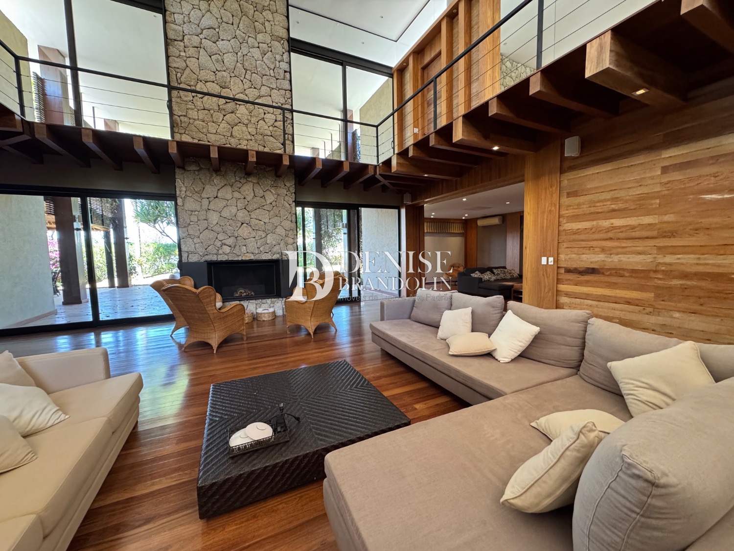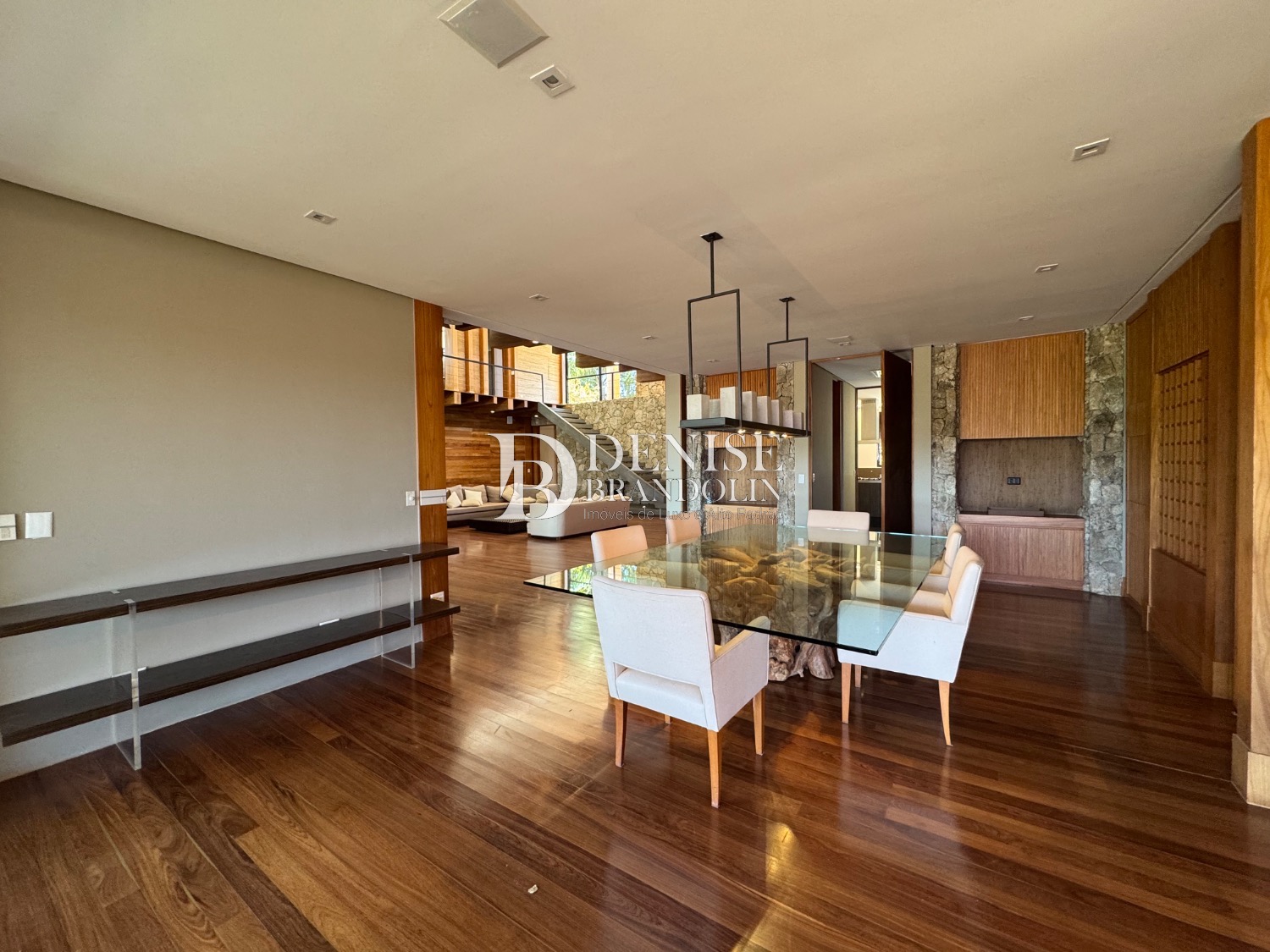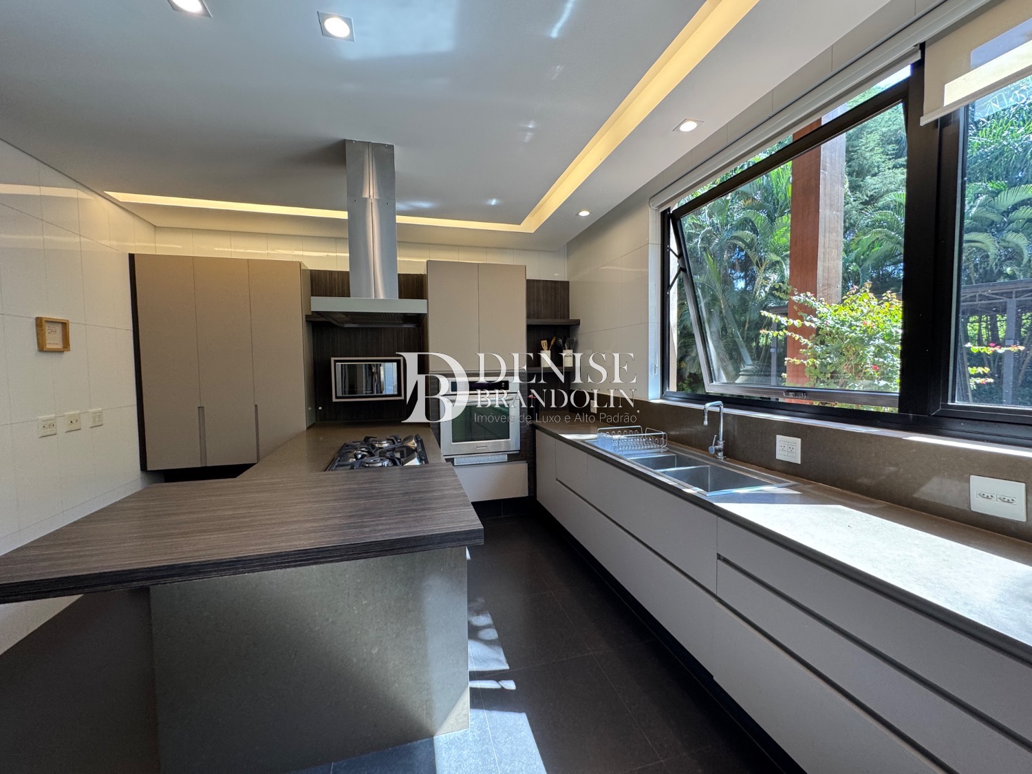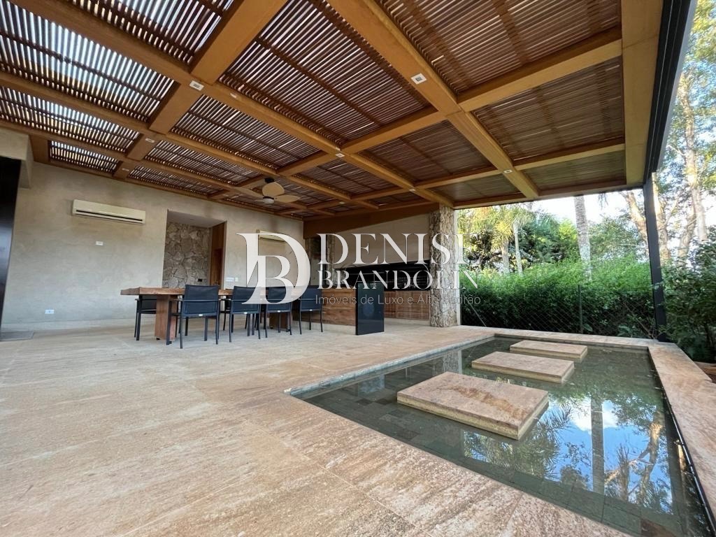 São 5 generosas suítes, living com pé direito duplo, sala de jantar integrada à imensa varanda gourmet, com ilha e mesa de apoio para 8 lugares. Piscina com deck molhado, sauna e extenso jardim já formado, proporcionando total privacidade aos moradores.