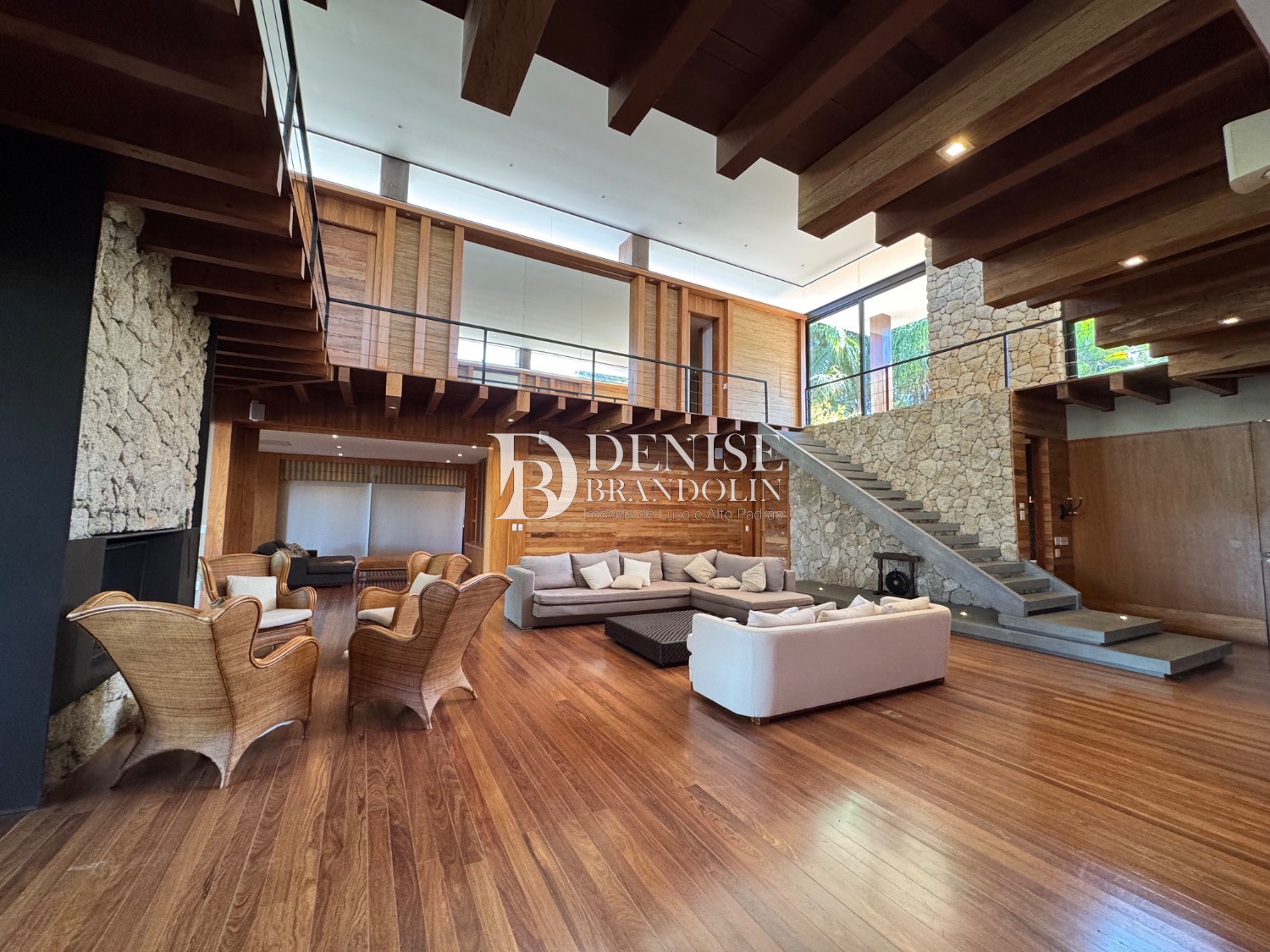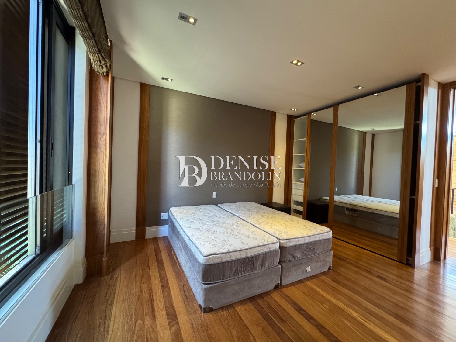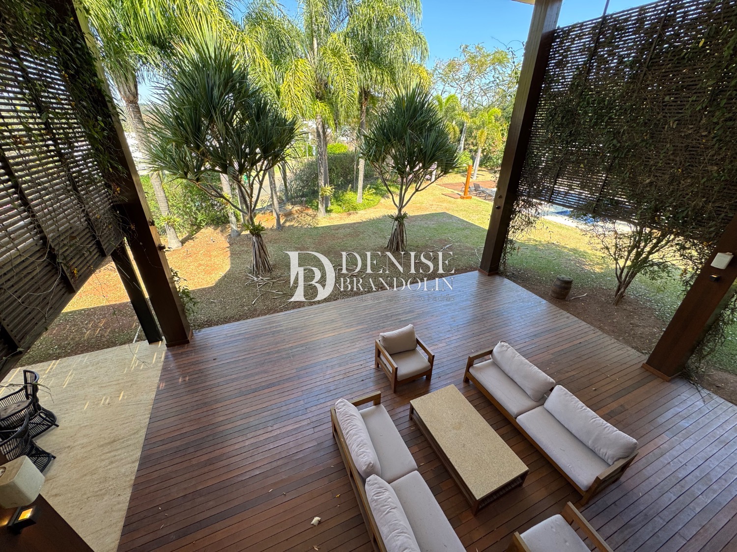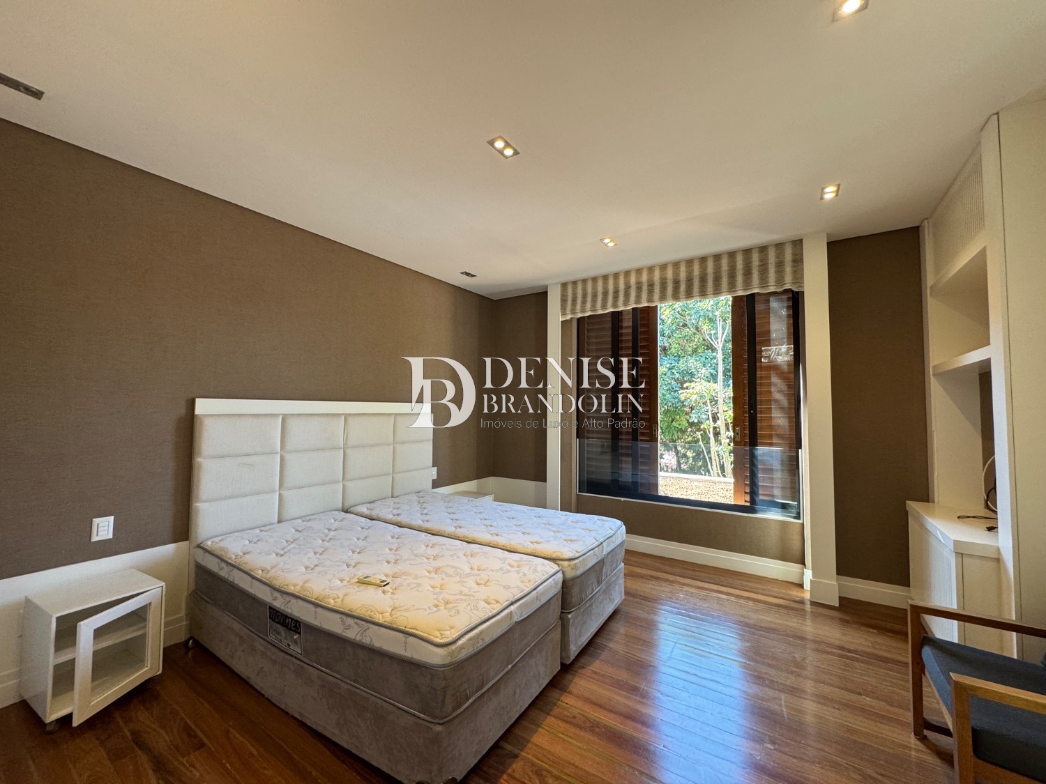 São 5 generosas suítes, living com pé direito duplo, sala de jantar integrada à imensa varanda gourmet, com ilha e mesa de apoio para 8 lugares. Piscina com deck molhado, sauna e extenso jardim já formado, proporcionando total privacidade aos moradores.