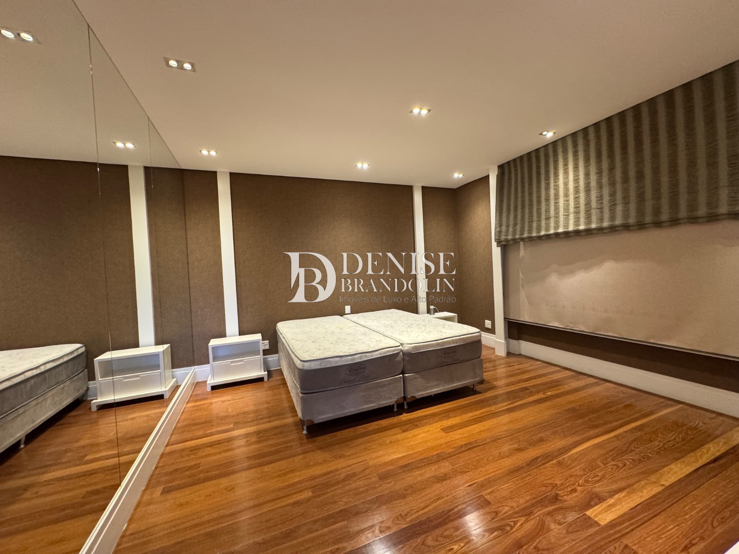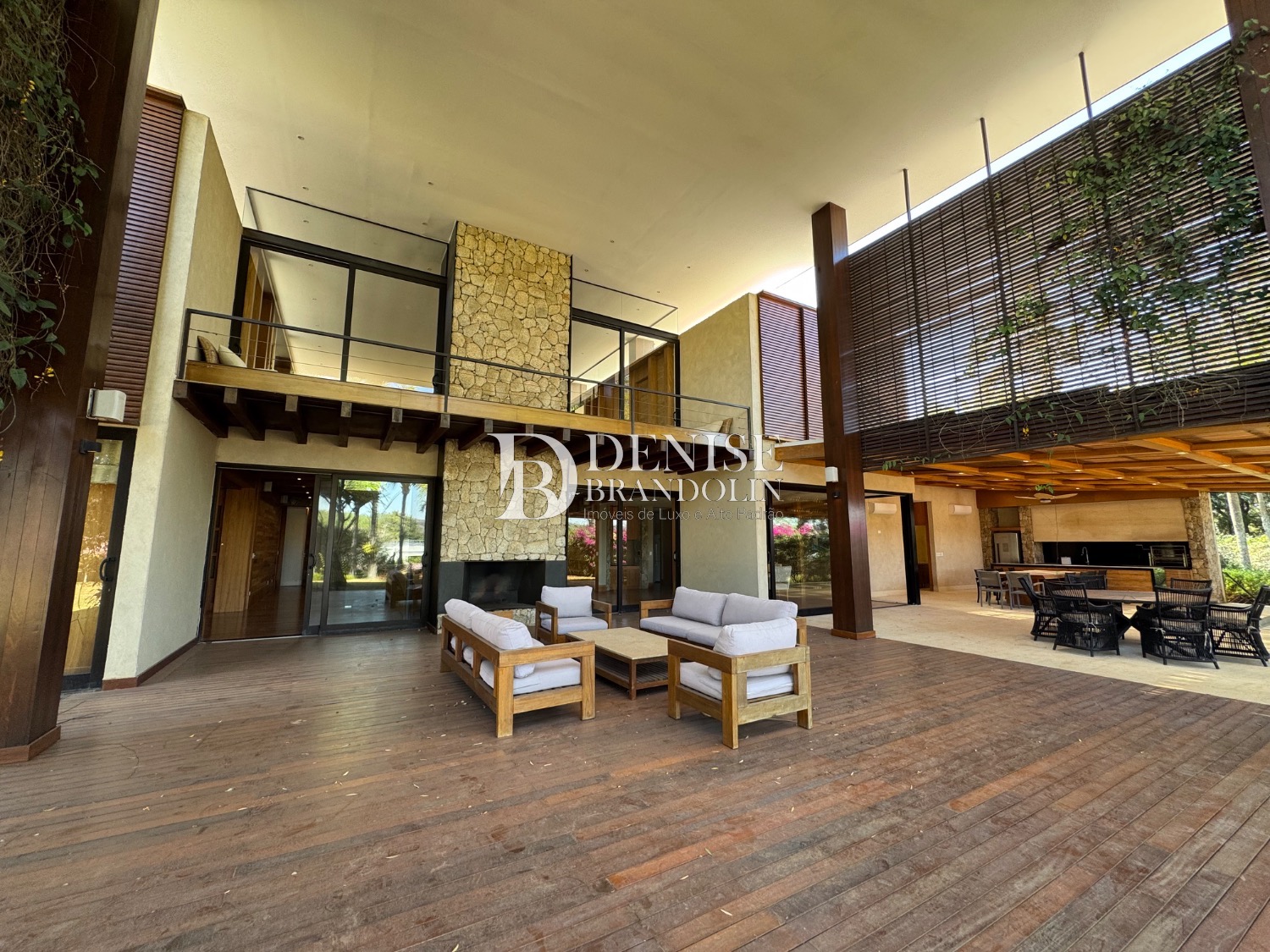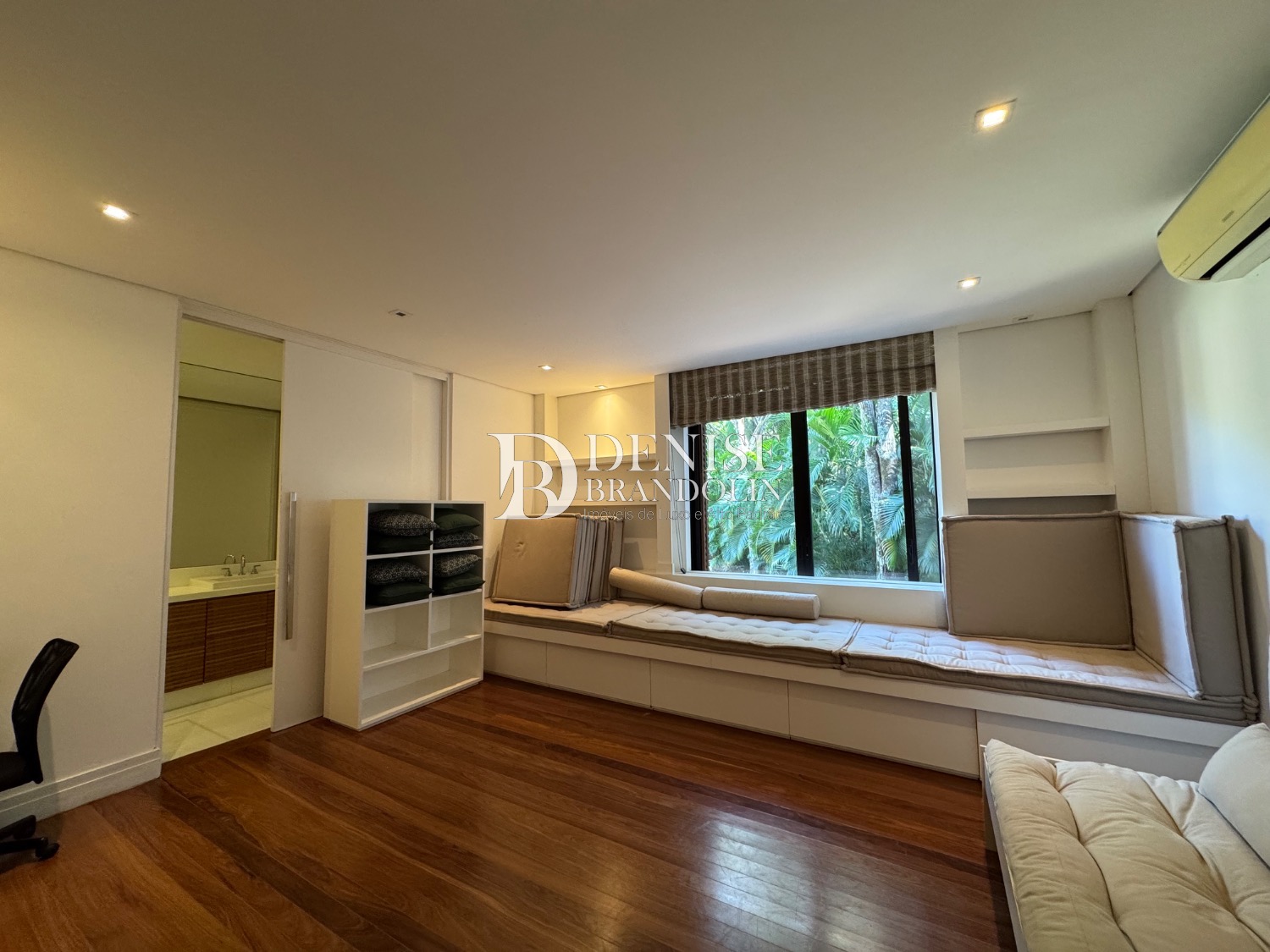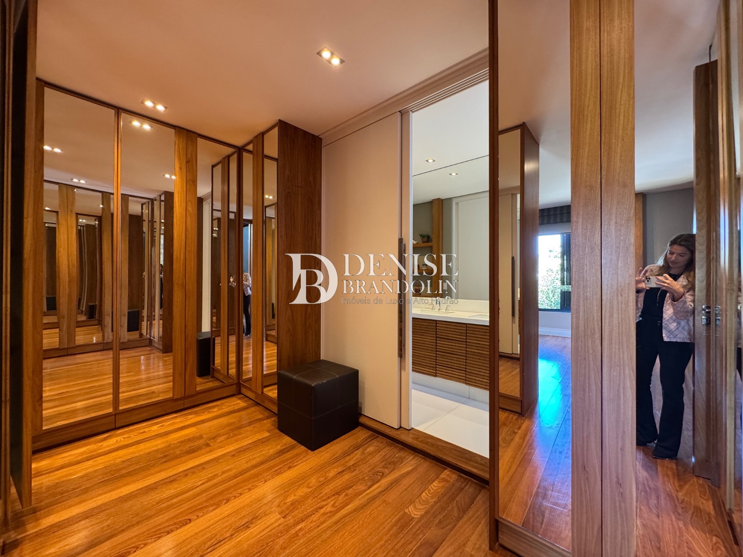 São 5 generosas suítes, living com pé direito duplo, sala de jantar integrada à imensa varanda gourmet, com ilha e mesa de apoio para 8 lugares. Piscina com deck molhado, sauna e extenso jardim já formado, proporcionando total privacidade aos moradores.