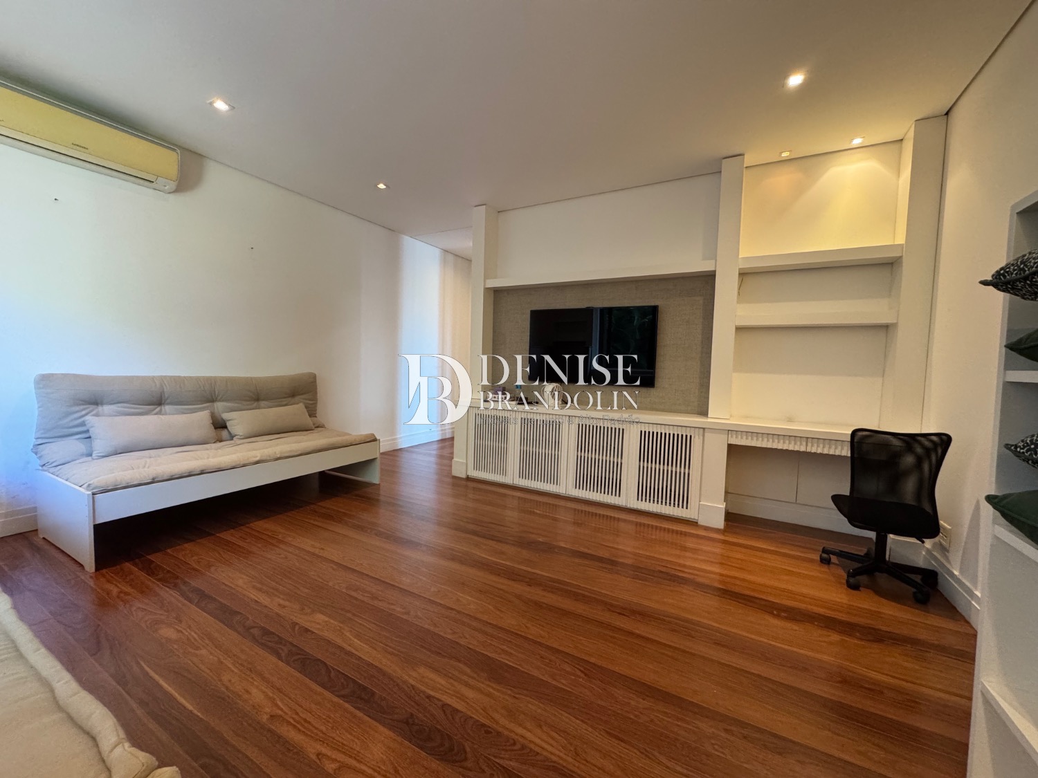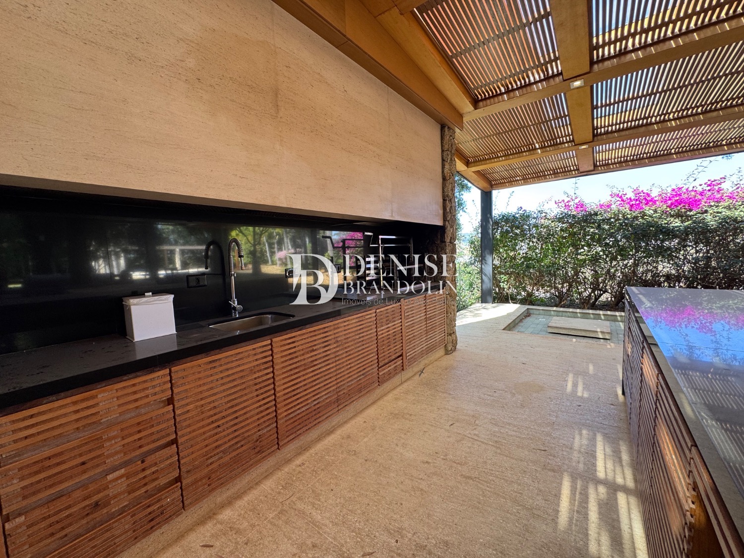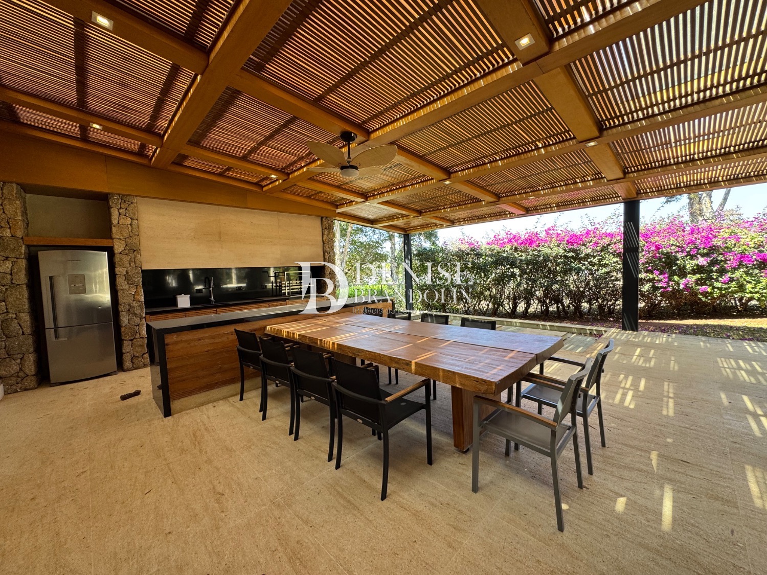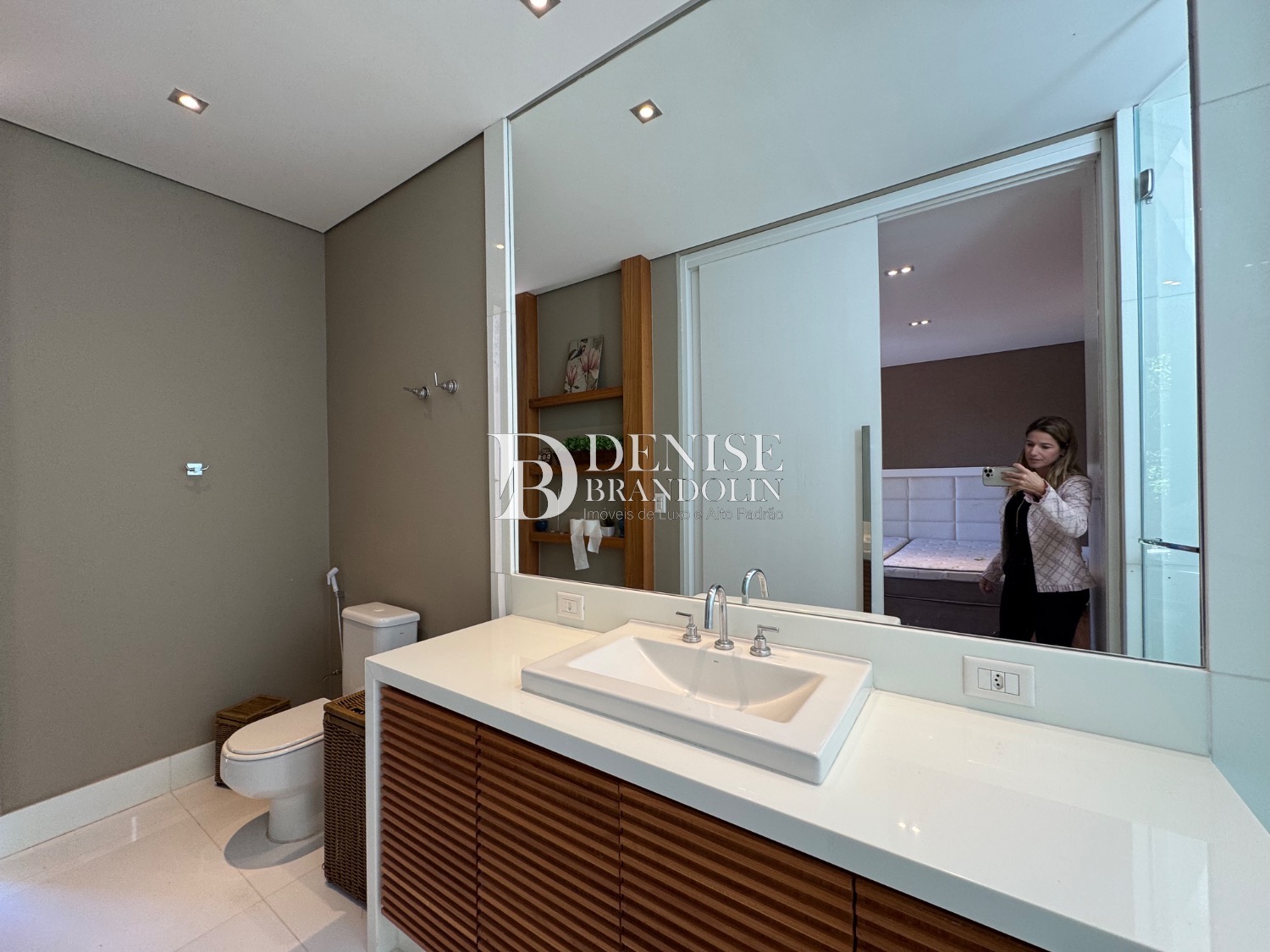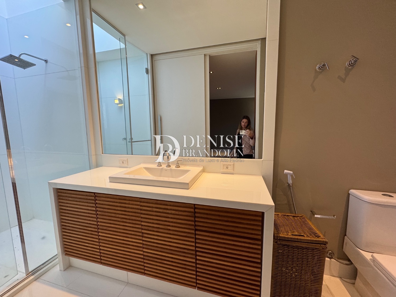 São 5 generosas suítes, living com pé direito duplo, sala de jantar integrada à imensa varanda gourmet, com ilha e mesa de apoio para 8 lugares. Piscina com deck molhado, sauna e extenso jardim já formado, proporcionando total privacidade aos moradores.