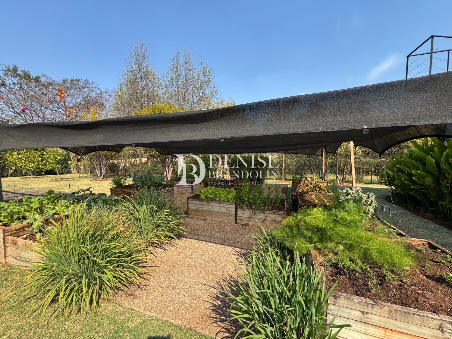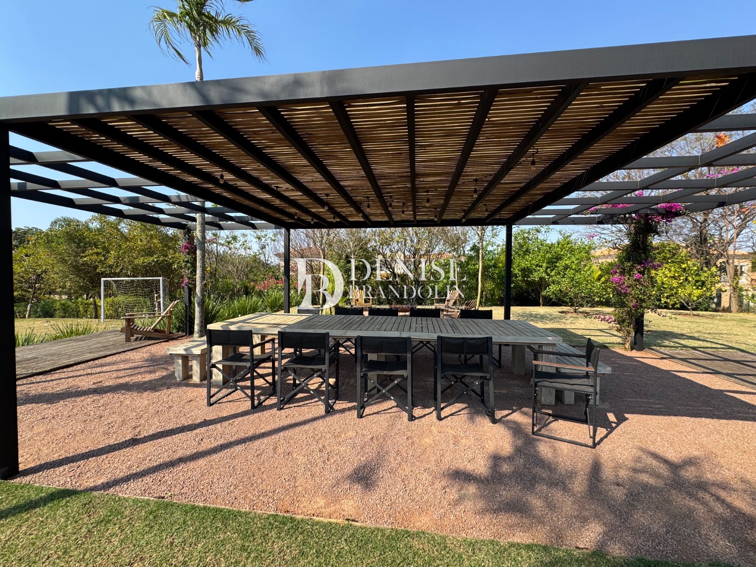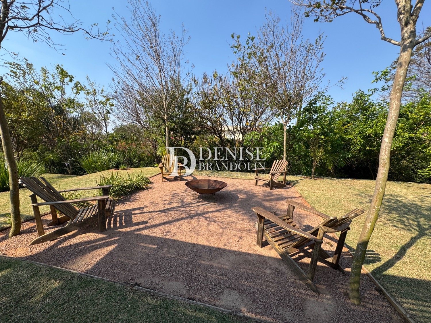 Jardim com pergolado, lareira externa, pomar, horta, campo de futebol e redario.