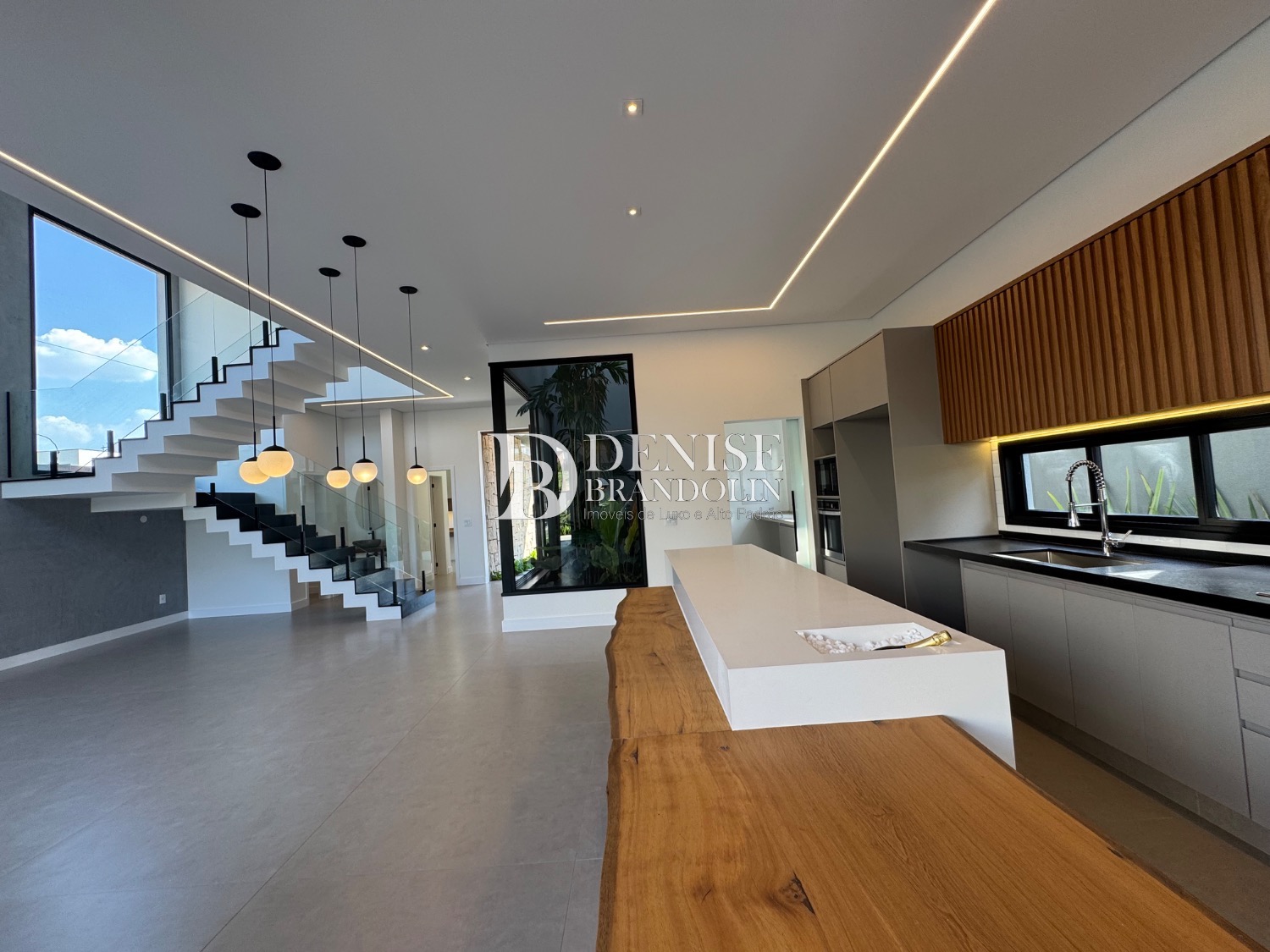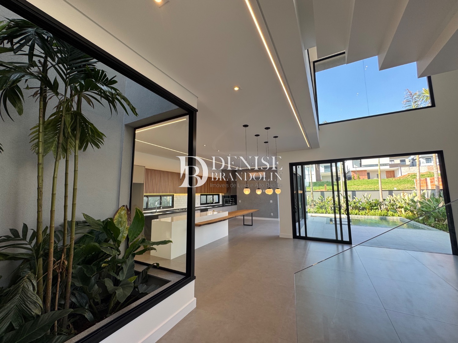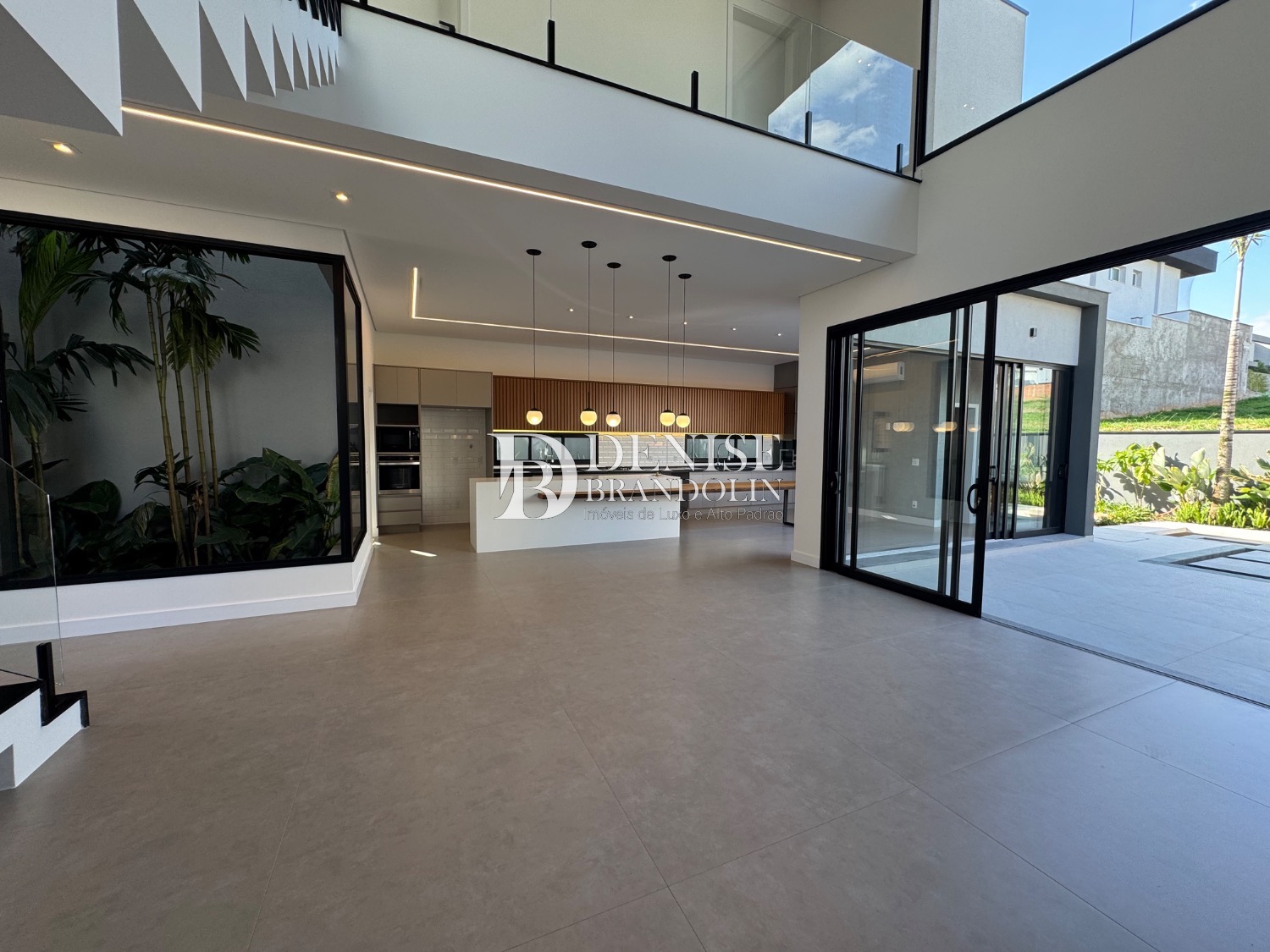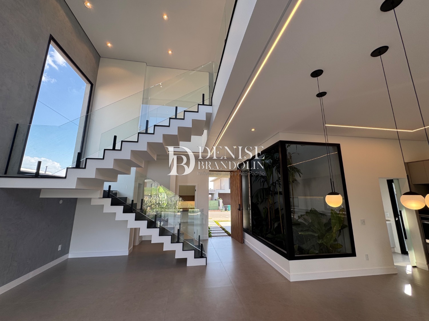 Living para vários ambientes sendo a sala de estar com lareira e pé direito duplo, lavabo, lindo jardim de inverno, escritório reversível (quarta suíte no térreo), cozinha entregue toda equipada com eletrodomésticos e planejados de alta qualidade. Lavanderia planejada.