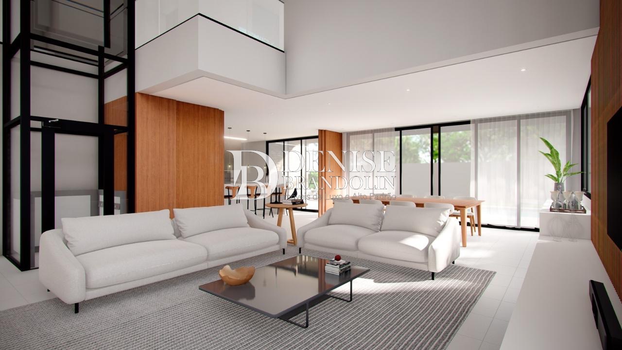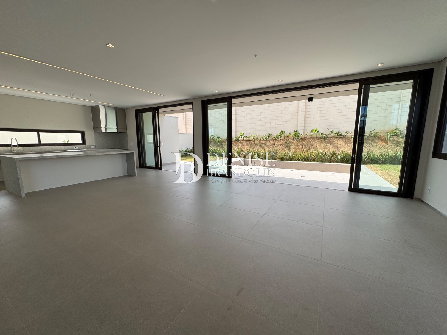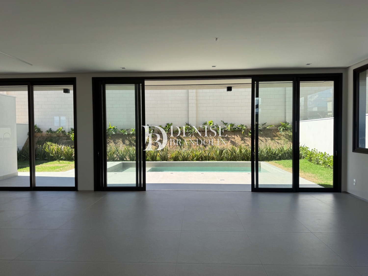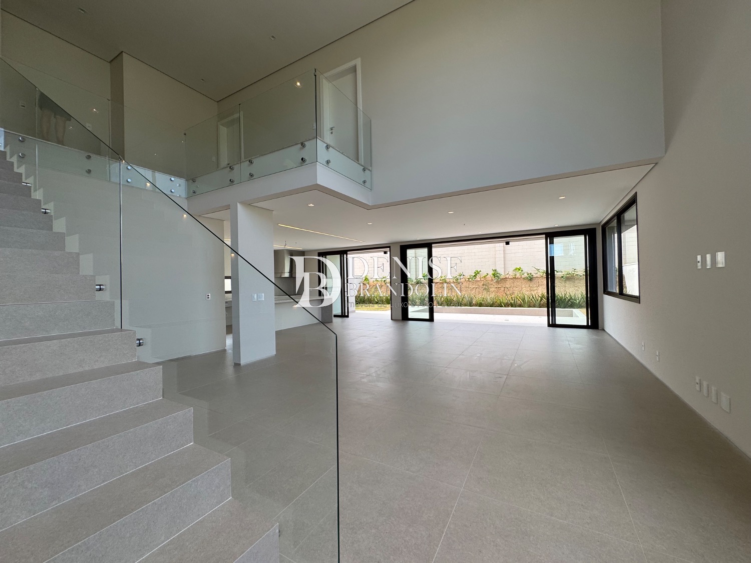 A casa conta com uma ampla sala com pé-direito duplo e grandes painéis de vidro, o que garante luminosidade e sensação de amplitude.