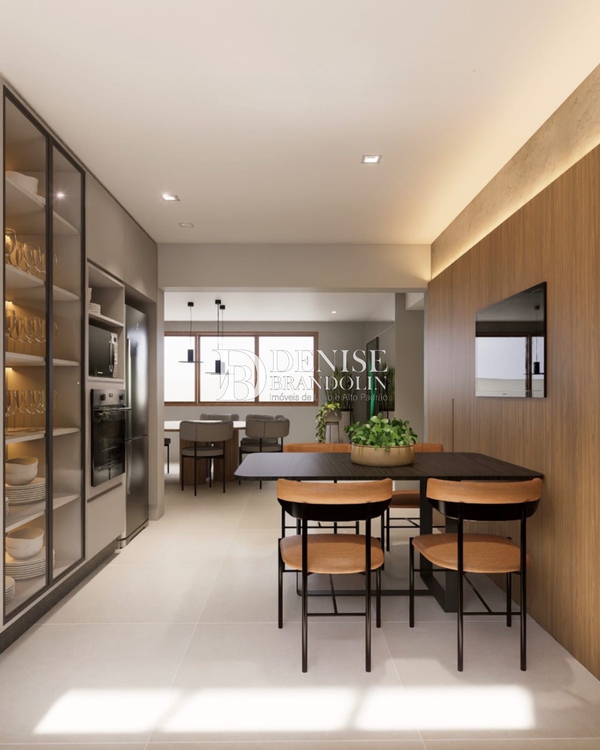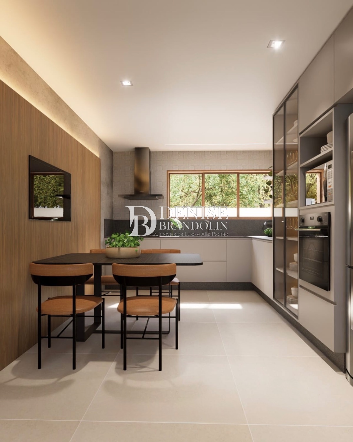• Três suítes no pavimento superior, sendo duas com acesso direto a uma ampla varanda, de onde se contempla a área de lazer e a piscina — um convite diário à pausa e ao descanso