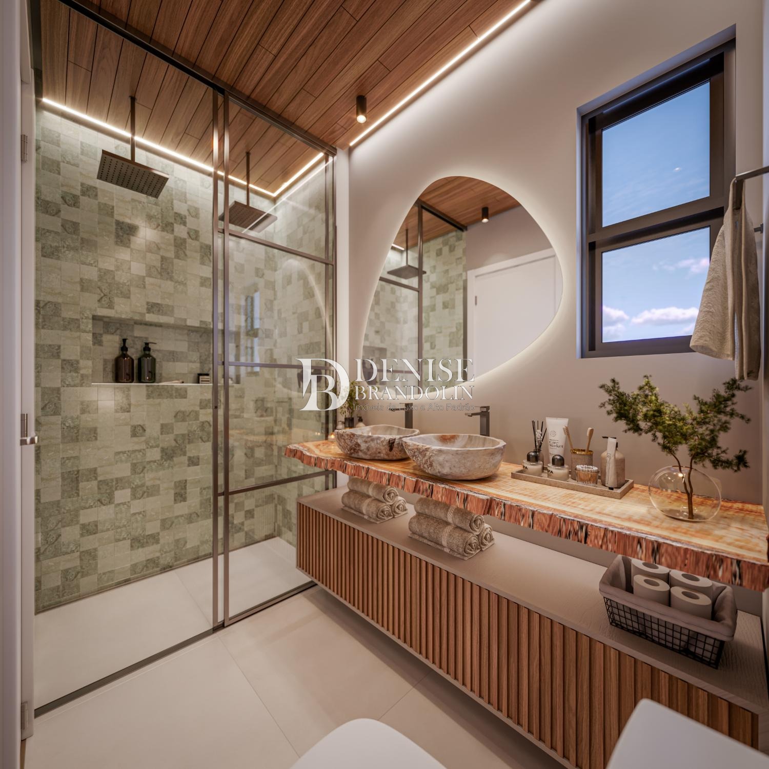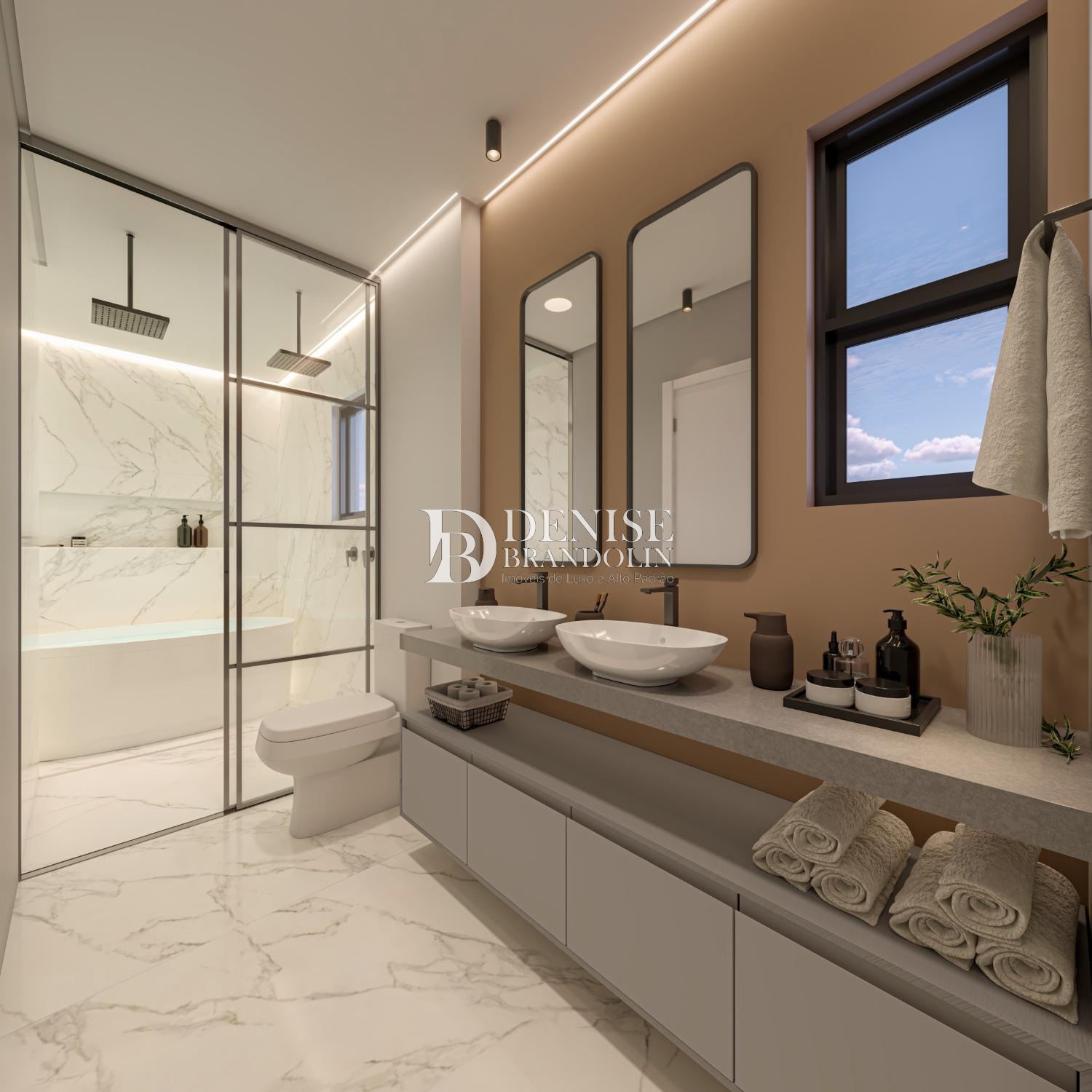 O conforto que um apartamento de luxo precisa, inclusive no banheiro da suíte master, que conta com opção de personalização de alvenaria, para um ambiente ampliado para instalação de banheira. Banheiro suíte master com cuba dupla e chuveiro duplo.
